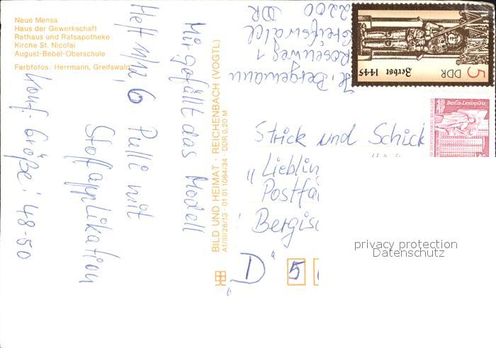 72414924 Greifswald Mecklenburg Vorpommern Neue Mensa Rathaus Ratsapotheke Sankt Nicolai Kirche postalisch nicht gelaufen Erhaltung siehe scans KatCode: 11110013001000