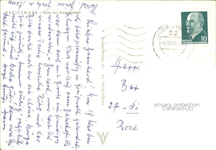 72053334 alte Postkarte Greifswald Mecklenburg Vorpommern Platz der Freundschaft postalisch gelaufen Erhaltung siehe scans KatCode: 11110013001000