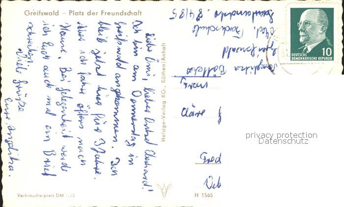 72057355 alte Postkarte Greifswald Mecklenburg Vorpommern Platz der Freundschaft Kirche postalisch gelaufen Erhaltung siehe scans KatCode: 11110013001000