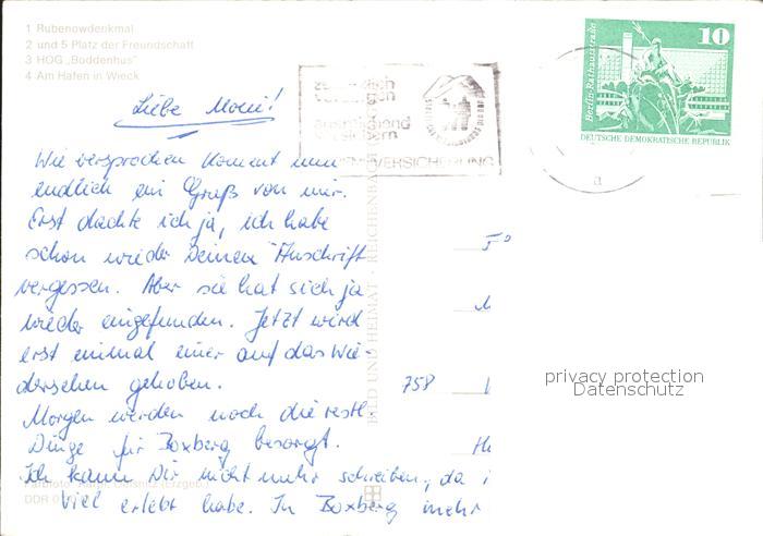 72336044 alte Postkarte Greifswald Mecklenburg Vorpommern Rubenowdenkmal Platz der Freundschaft HOG Boddenhus Hafen Wieck postalisch gelaufen Erhaltung siehe scans KatCode: 11110013001000