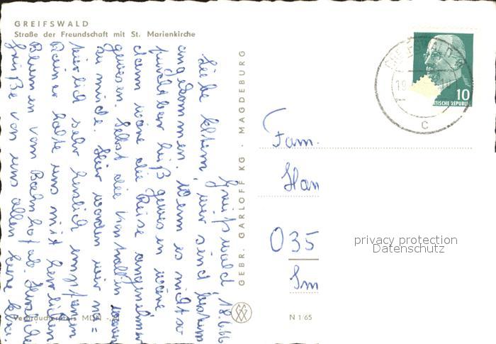 71997425 alte Postkarte Greifswald Mecklenburg Vorpommern Strasse Freundschaft St Marienkirche postalisch gelaufen KatCode: 11110013001000