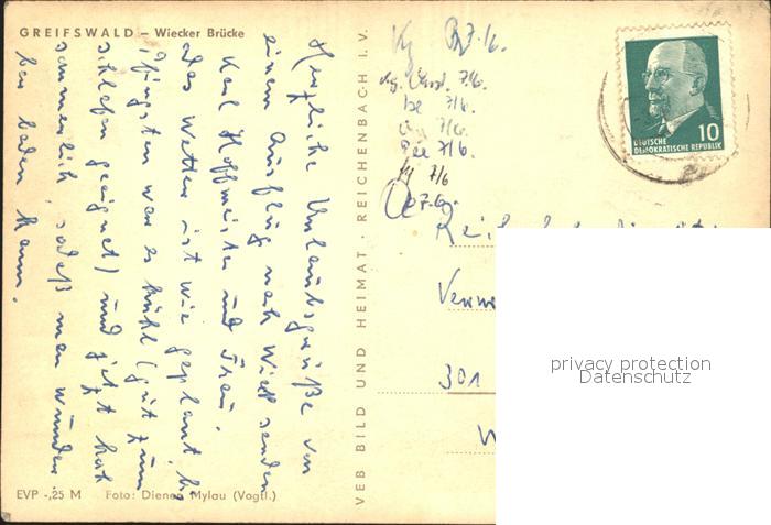 72056283 alte Postkarte Greifswald Mecklenburg Vorpommern Wiecker Bruecke postalisch gelaufen Erhaltung siehe scans KatCode: 11110013001000