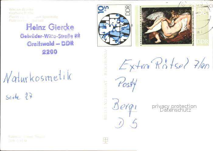 72401244 alte Postkarte Greifswald Mecklenburg Vorpommern Wiecker Bruecke Kaufhalle 8. Mai Platz der Freundschaft Denkmal postalisch gelaufen Erhaltung siehe scans KatCode: 11110013001000