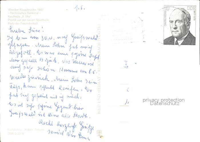 72325897 alte Postkarte Greifswald Mecklenburg Vorpommern Wiecker Klappbruecke Kaufhalle Sporthalle postalisch gelaufen Erhaltung siehe scans KatCode: 11110013001000