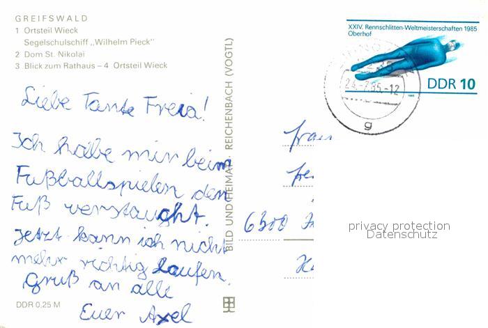 72633871 alte Postkarte Greifswald OT Wieck Segelschulschiff Wilhelm Pieck Dom St Nikolai Rathaus Hafen Motorboot Bruecke Wappen postalisch gelaufen Erhaltung siehe scans [FriedD77] KatCode: 11110013001000
