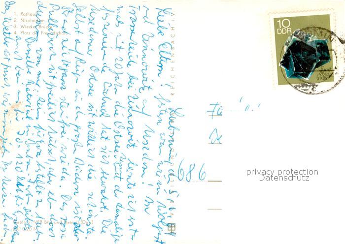 73649850 alte Postkarte Greifswald Rathaus Nikolaidom Wiecker Bruecke Platz der Freundschaft postalisch gelaufen Erhaltung siehe scans [FriedD77] KatCode: 11110013001000