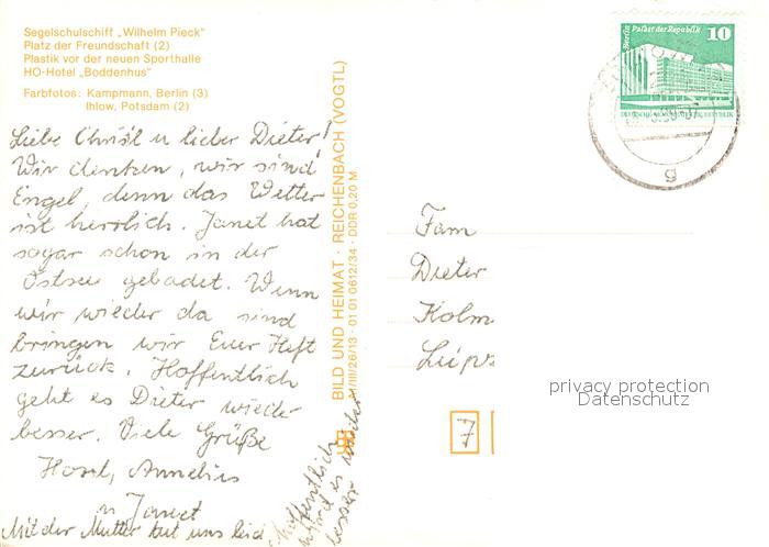 73026393 alte Postkarte Greifswald Segelschulschiff Wilhelm Pieck HO Hotel Boddenhus Plastik Sporthalle postalisch gelaufen Erhaltung siehe scans [KathaD81] KatCode: 11110013001000