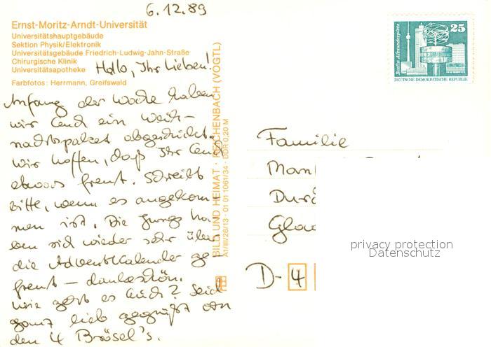 73017806 alte Postkarte Greifswald Unigebaeude Sektion Physik Friedrich Ludwig Jahn Strasse Chirurgische Klinik Universitaetsapotheke postalisch gelaufen Erhaltung siehe scans [WerneD78] KatCode: 11110013001000