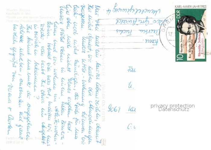 72652023 alte Postkarte Greifswald Wiecker Bruecke Kaufhalle Plastik Brunnen Platz der Freundschaft postalisch gelaufen Erhaltung siehe scans [FriedD77] KatCode: 11110013001000