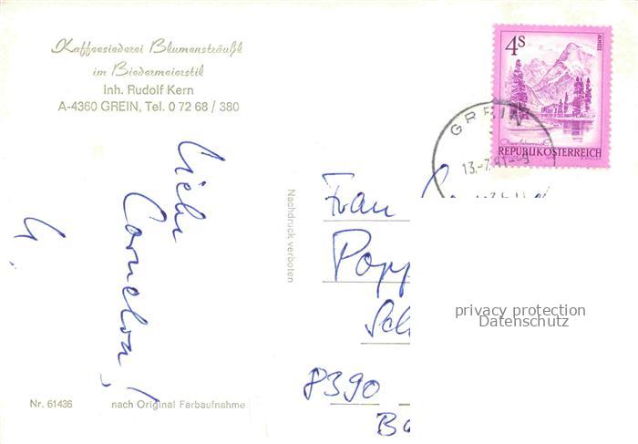 74018991 alte Postkarte Grein Donau Oberoesterreich AT Kaffeesiederei Blumenstraeussl im Biedermeierstil Billard postalisch gelaufen Erhaltung siehe scans [FriedD77] KatCode: 11390313041105