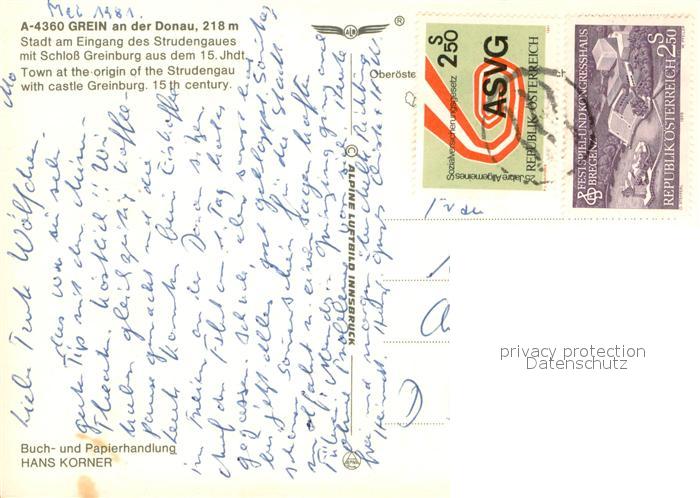73660825 alte Postkarte Grein Donau Oberoesterreich Fliegeraufnahme mit Schloss Greinburg postalisch gelaufen Erhaltung siehe scans [WerneD78] KatCode: 11390313041105