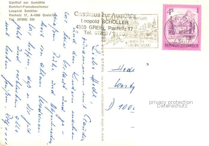 73643889 alte Postkarte Grein Donau Oberoesterreich Gasthof zur Aumuehle Schlucht Wanderweg Wasserfall postalisch gelaufen Erhaltung siehe scans [FriedD77] KatCode: 11390313041105