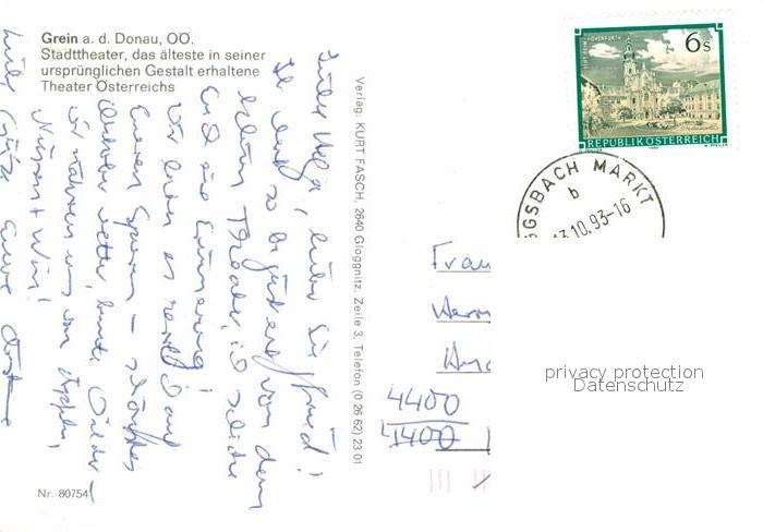 72674203 alte Postkarte Grein Donau Oberoesterreich Stadttheater Buehne postalisch gelaufen Erhaltung siehe scans [FriedD77] KatCode: 11390313041105
