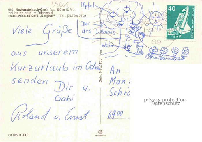 74048730 alte Postkarte Grein Neckarsteinach Hotel Cafe Berghof Terrasse postalisch gelaufen Erhaltung siehe scans [WerneD78] KatCode: 11110006431018