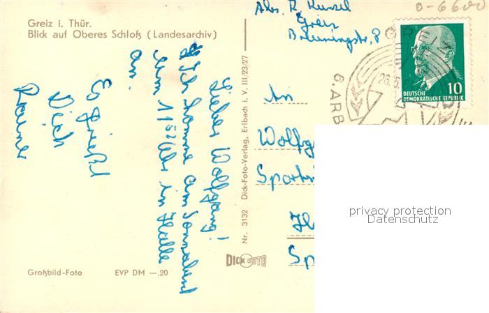 43366692 alte Postkarte Greiz Thueringen Blick auf Oberes Schloss Landesarchiv Bruecke postalisch gelaufen Erhaltung siehe scans [FriedD77] KatCode: 11110016076022