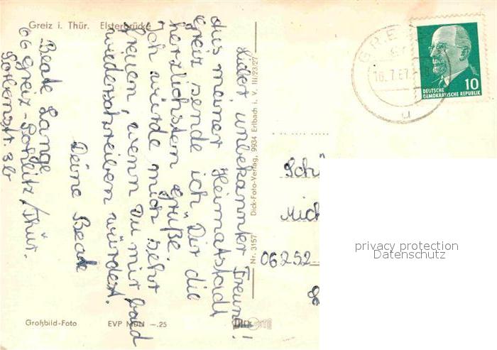 72868352 alte Postkarte Greiz Thueringen Elsterbruecke Burg postalisch gelaufen Erhaltung siehe scans [FriedD77] KatCode: 11110016076022