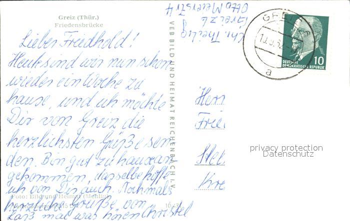 72471934 alte Postkarte Greiz Thueringen Friedensbruecke postalisch gelaufen Erhaltung siehe scans KatCode: 11110016076022