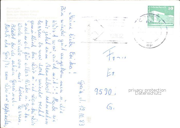 72322764 alte Postkarte Greiz Thueringen Leninpark Blumenuhrn Oberes Schloss Weisses Kreuz Denkmal Sommerpalais postalisch gelaufen Erhaltung siehe scans KatCode: 11110016076022