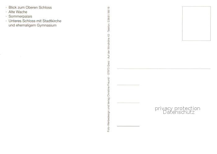 73236076 Greiz Thueringen Oberes Schloss Alte Wache Sommerpalais Unseres Schloss Stadtkirche postalisch nicht gelaufen Erhaltung siehe scans [KathaD81] KatCode: 11110016076022