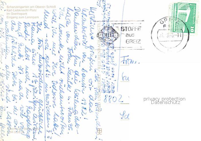 72919645 alte Postkarte Greiz Thueringen Schanzengarten Oberes Schloss Karl Liebknecht Platz Goethepark Leninpark Skulptur postalisch gelaufen Erhaltung siehe scans [FriedD77] KatCode: 11110016076022