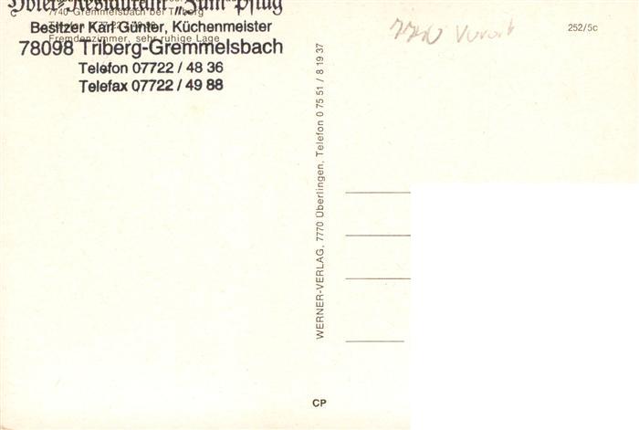 73927275 Gremmelsbach Triberg Hotel Restaurant Zum Pflug postalisch nicht gelaufen Erhaltung siehe scans [FriedD77] KatCode: 11110008326060