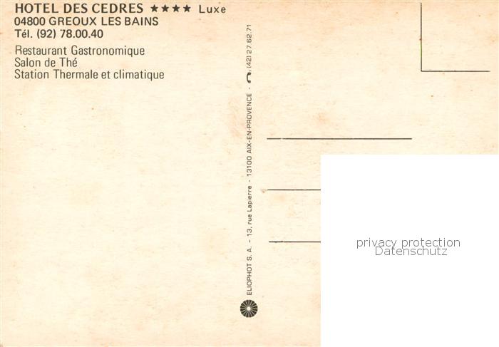 13781509 Greoux-les-Bains 04 Hotel des Cedres Restaurant Gastronomique Salon de The Station Thermale et climatique postalisch nicht gelaufen Erhaltung siehe scans [WerneD78] Wern Katcode 11170004304094