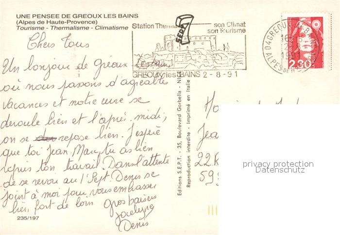 13337368 carte postale Greoux-les-Bains postalisch gelaufen Erhaltung siehe scans [LiesaD40] KatCode: 11170004304094