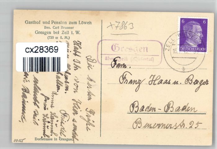 30910568 alte Postkarte Gresgen Zell Wiesental Gasthof Pension zum Loewen postalisch gelaufen KatCode: 11110008336103