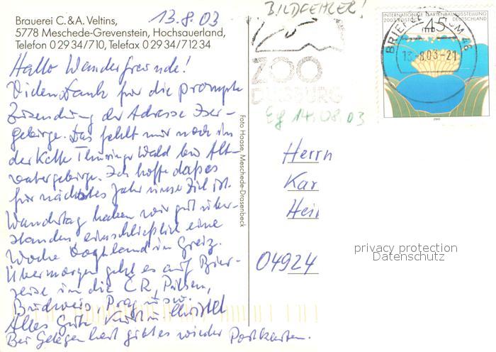 73744874 alte Postkarte Grevenstein Brauerei Veltins postalisch gelaufen Erhaltung siehe scans [FriedD77] KatCode: 11110005958032