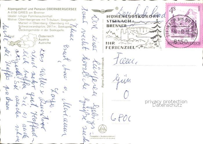 71915725 alte Postkarte Gries Brenner Alpengasthof Obernbergersee Tribulaun Seegasthof Martrl Schwarzwandspitze Seekapelle Deckengemaelde postalisch gelaufen Erhaltung siehe scans KatCode: 11390332070313