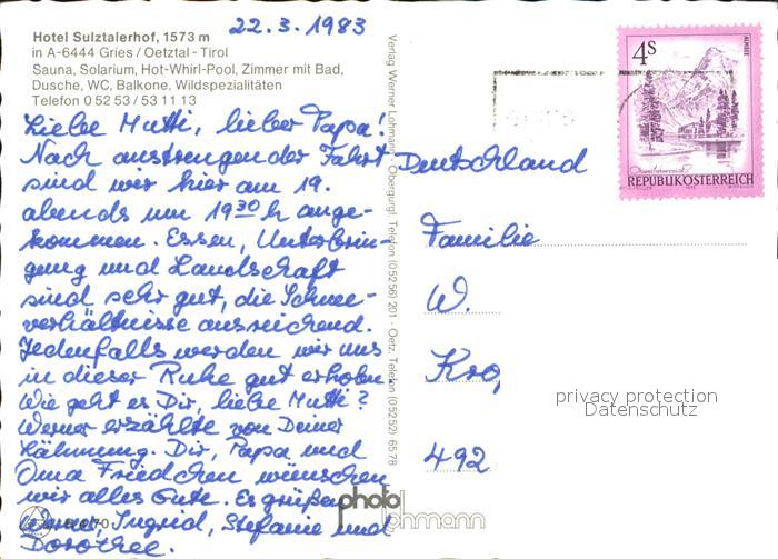 12560882 alte Postkarte Gries Laengenfeld Tirol Hotel Sulztalerhof postalisch gelaufen Erhaltung siehe scans [NatalD47] KatCode: 11390334070208