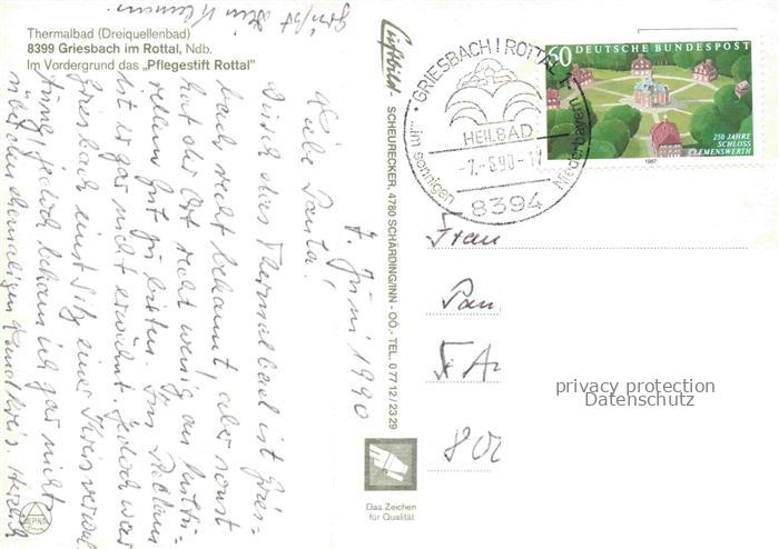 74157643 alte Postkarte Griesbach Bad im Rottal Bayern Thermalbad Dreiquellenbad Pflegestift-Rottal Kirchturm Felder Dorf Luftbild postalisch gelaufen Fliegeraufnahme Erhaltung siehe scans [Karloger] KatCode: 11110009275124