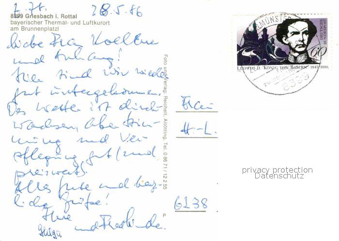 72868769 alte Postkarte Griesbach Rottal Brunnenplatzl Statue Thermalbad Luftkurort postalisch gelaufen Erhaltung siehe scans [FriedD77] KatCode: 11110009275124