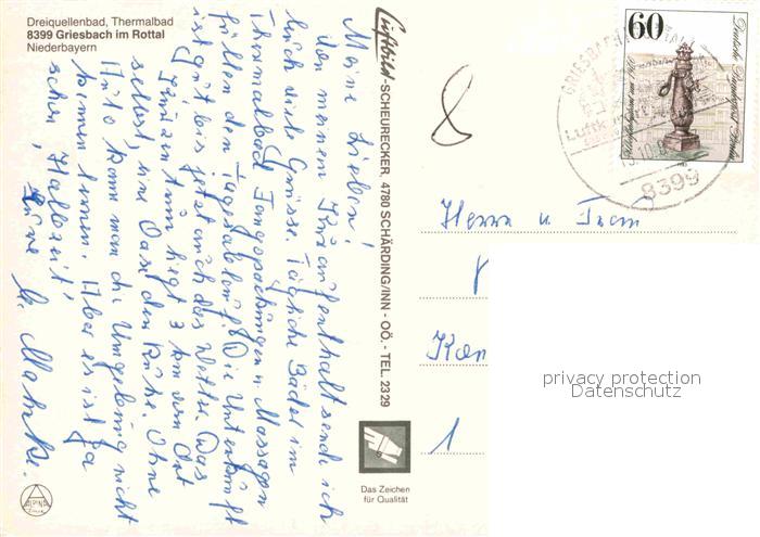 72928904 alte Postkarte Griesbach Rottal Dreiquellenbad Thermalbad postalisch gelaufen Erhaltung siehe scans [FriedD77] KatCode: 11110009275124