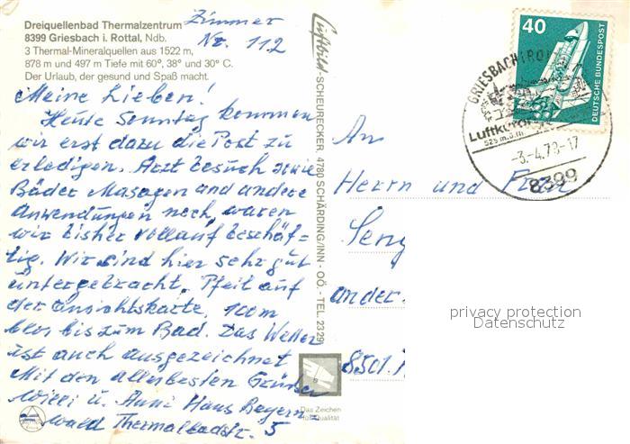 72765313 alte Postkarte Griesbach Rottal Dreiquellenbad Thermalzentrum Fliegeraufnahme postalisch gelaufen Erhaltung siehe scans [FriedD77] KatCode: 11110009275124
