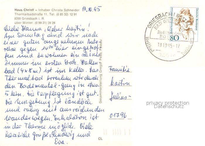 73711892 alte Postkarte Griesbach Rottal Haus Christl Aussenansicht postalisch gelaufen Erhaltung siehe scans [LiesaD40] KatCode: 11110009275124