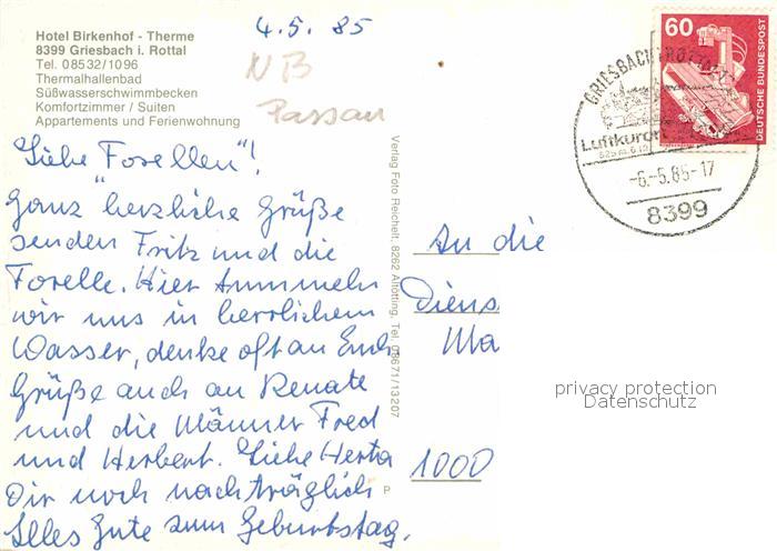 72885615 alte Postkarte Griesbach Rottal Hotel Birkenhof Therme Thermalbad postalisch gelaufen Erhaltung siehe scans [FriedD77] KatCode: 11110009275124