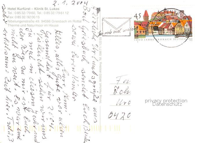 73050783 alte Postkarte Griesbach Rottal Hotel Kurfuerst Klinik Sankt Lukas postalisch gelaufen Erhaltung siehe scans [KathaD81] KatCode: 11110009275124