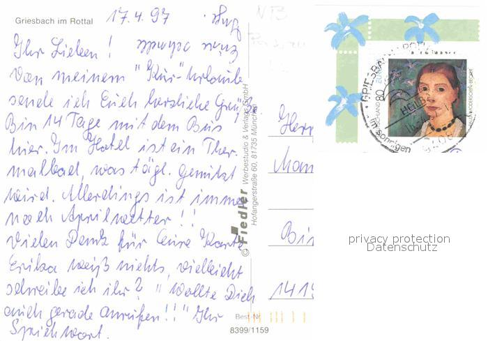 72885617 alte Postkarte Griesbach Rottal Platz Denkmal Statue Blick zur Kirche postalisch gelaufen Erhaltung siehe scans [FriedD77] KatCode: 11110009275124