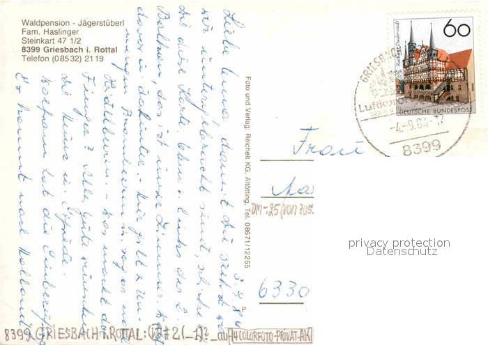 72747246 alte Postkarte Griesbach Rottal Waldpension Jaegerstueberl postalisch gelaufen Erhaltung siehe scans [LiesaD40] KatCode: 11110009275124