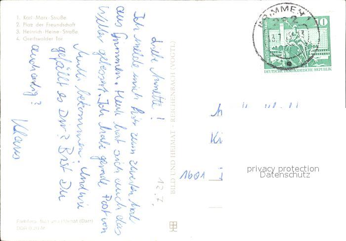 72382832 alte Postkarte Grimmen Karl-Marx-Strasse Platz der Freundschaft Heinrich-Heine-Strasse postalisch gelaufen Erhaltung siehe scans KatCode: 11110013057036