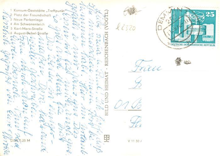 73907763 alte Postkarte Grimmen Konsum Gaststaette Treffpunkt Platz der Freundschaft Neue Parkanlage Am Schwanenteich Karl-Marx Strasse Aug Bebelstrasse postalisch gelaufen Erhaltung siehe scans [FriedD77] KatCode: 11110013057036