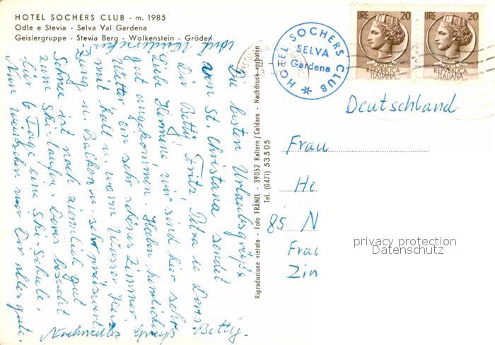 old postcard Groeden Tirol Hotel Sochers Club Wintersportplatz Geislergruppe Stevia Berg Wolkenstein postalisch gelaufen Erhaltung siehe scans [FriedD77]