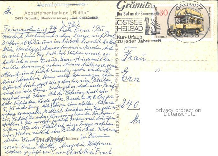 72059187 alte Postkarte Groemitz Ostseebad Appartementanlage Baltic Strand Ostseeheilbad Fliegeraufnahme postalisch gelaufen Erhaltung siehe scans KatCode: 11110001055016