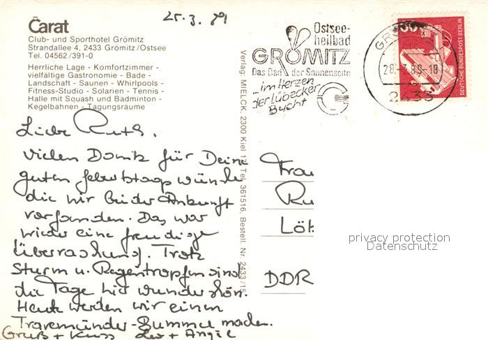 73119853 alte Postkarte Groemitz Ostseebad Club- und Sporthotel Carat postalisch gelaufen Erhaltung siehe scans [LiesaD40] KatCode: 11110001055016