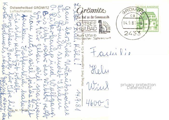 72653581 alte Postkarte Groemitz Ostseebad Hafen Strand Fliegeraufnahme postalisch gelaufen Erhaltung siehe scans [FriedD77] KatCode: 11110001055016