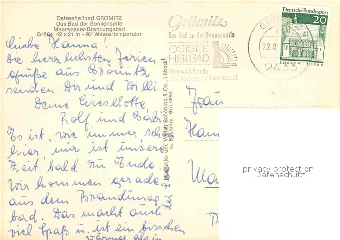 72715536 alte Postkarte Groemitz Ostseebad Meerwasser Brandungsbad Hallenbad postalisch gelaufen Erhaltung siehe scans [FriedD77] KatCode: 11110001055016