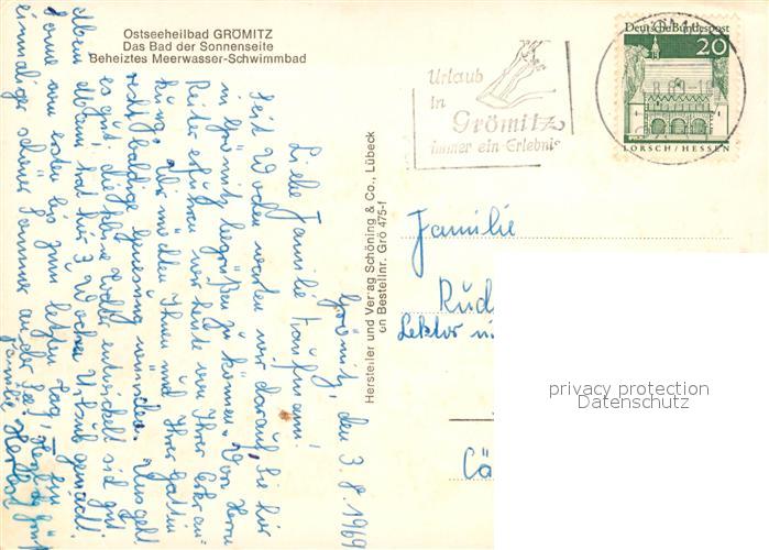 73125773 alte Postkarte Groemitz Ostseebad Meerwasser-Schwimmbad postalisch gelaufen Erhaltung siehe scans [LiesaD40] KatCode: 11110001055016