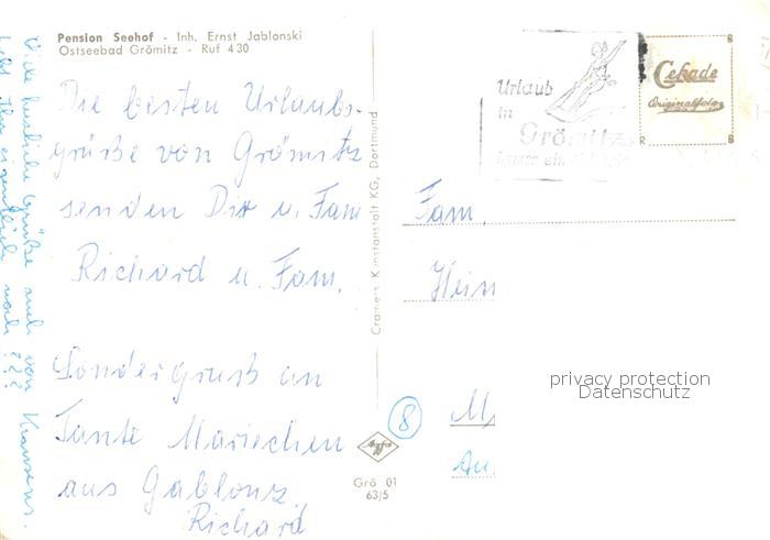 73833296 alte Postkarte Groemitz Ostseebad Pension Seehof postalisch gelaufen Erhaltung siehe scans [FriedD77] KatCode: 11110001055016