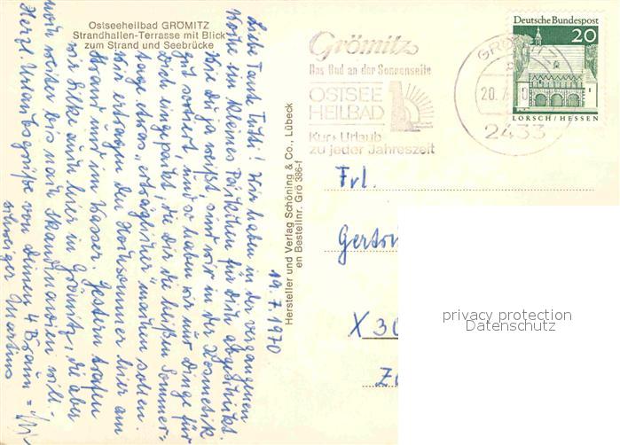 72647529 alte Postkarte Groemitz Ostseebad Strandhallen Terrasse Strand Seebruecke postalisch gelaufen Erhaltung siehe scans [WerneD78] KatCode: 11110001055016
